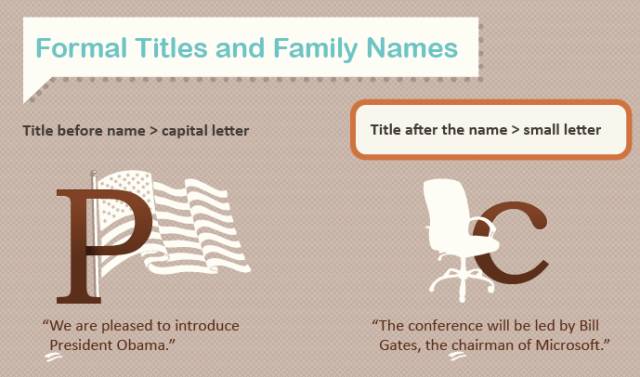 头衔和称呼在名字前面要首字母大写,例如:
