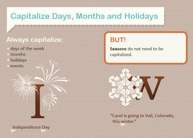 星期、 月份、 节假日(节日名称的第一个实词首字母)的首字母要大写。但是季节不用,例如: