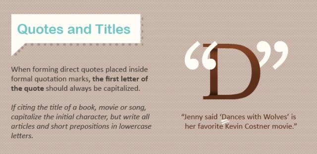引号直接引用的话,引用的话首字母一定要大写。当引用书名、电影名、歌名的时候首字母要大写,但介词不用大写(如of, and, the之类的冠词和介词就不用)。例如: