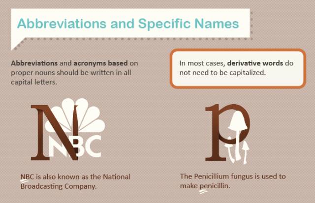 缩略词和基于专有名词的缩略词,所有字母都需要大写。但是,大多数情况下,派生词不需要大写。
