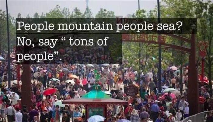 *Instead of saying "people mountain people sea", you should say "tons of people": 以后别再说“people mountain people sea"这个错误的老梗了,大家跟我说“tons of people"