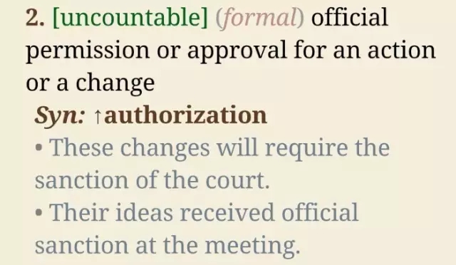 当sanction 表示“正式许可,批准,接受”时,前面的动词一般为 receive, require, get 等,后置介词则为with/without